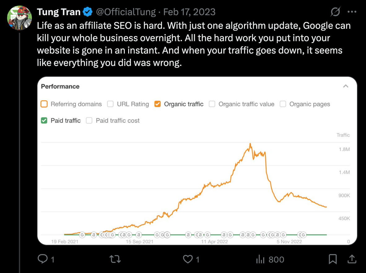 One operating theory about the HCU classifier goes like this: if your site is a doorway, meaning users go from the SERPs to your post and then straight to an affiliate offer, you’re “not being helpful” – and Google wants to cut you out.